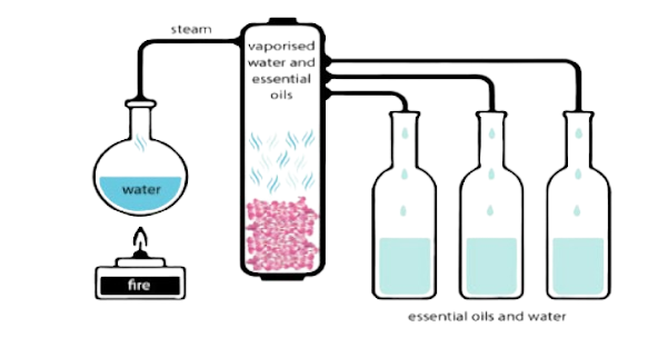 Water distillation works on a similar concept as steam distillation. This technique is employed for fragile blossoms that, if bruised or destroyed, would provide inferior oil. This technique produces two essential oils: Rose Otto (Rosa damascena) and Ylang Ylang.